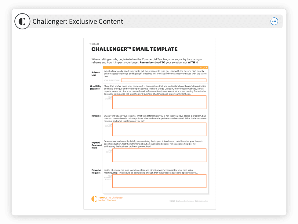 Challenger research will tell you 53% of customer loyalty is based on an insight-led sales experience. Despite this, many sellers still focus their experience around products or a conversation on price. They speed through discovery to get to the demo. Buyers need more. This module will walk you step by step through securing, preparing for, and executing a successful meeting that leads with insight rather than product. This approach teaches the buyer something about their business and motivates buyers into action.